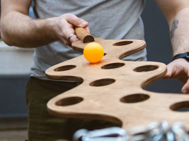 Задача участников — прокатывать мячик по полю, направляя его так, чтобы он упал в корзину, расположенную в центре конструкции.