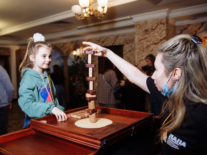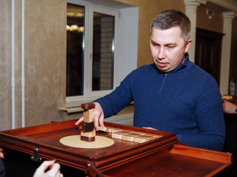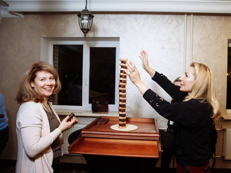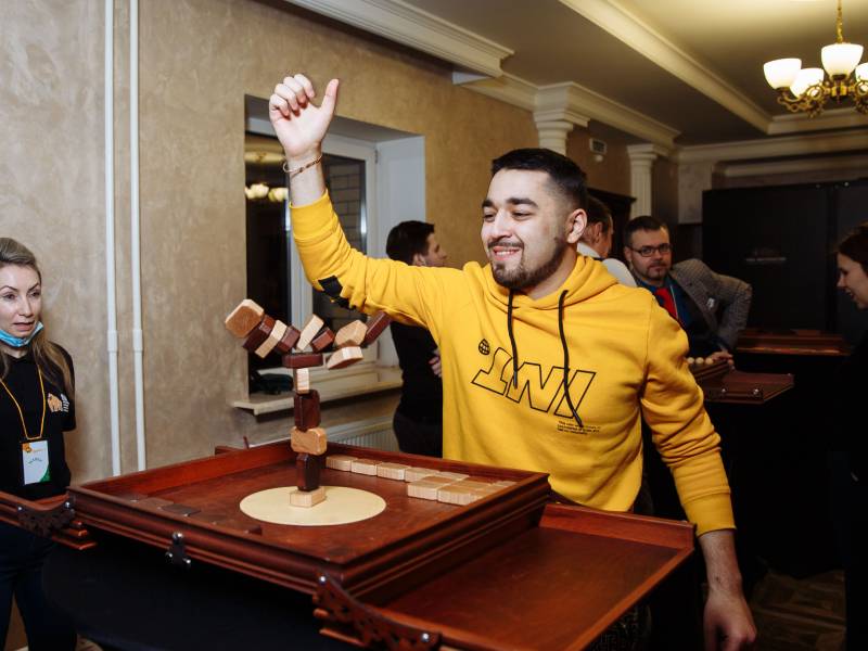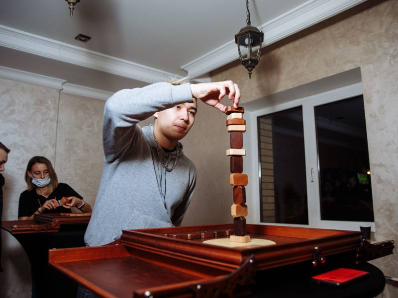 Динамичное испытание на ловкость, точность и выдержку. Участники по очереди аккуратно устанавливают бруски, стараясь сохранить устойчивость конструкции. Каждый ход повышает напряжение, а одно неверное движение может привести к падению башни и поражению игрока. Идеально подходит для корпоративных мероприятий и активных зон на праздниках.
