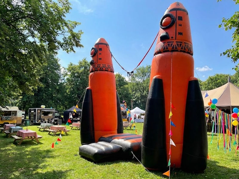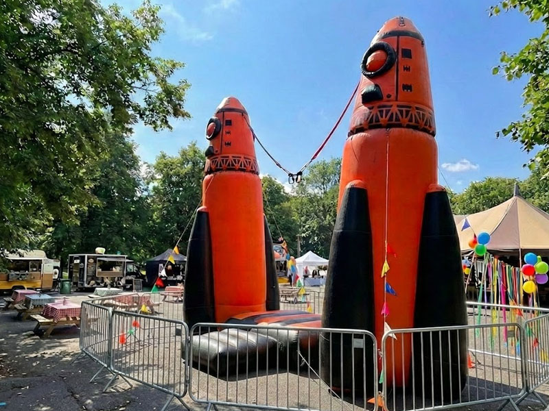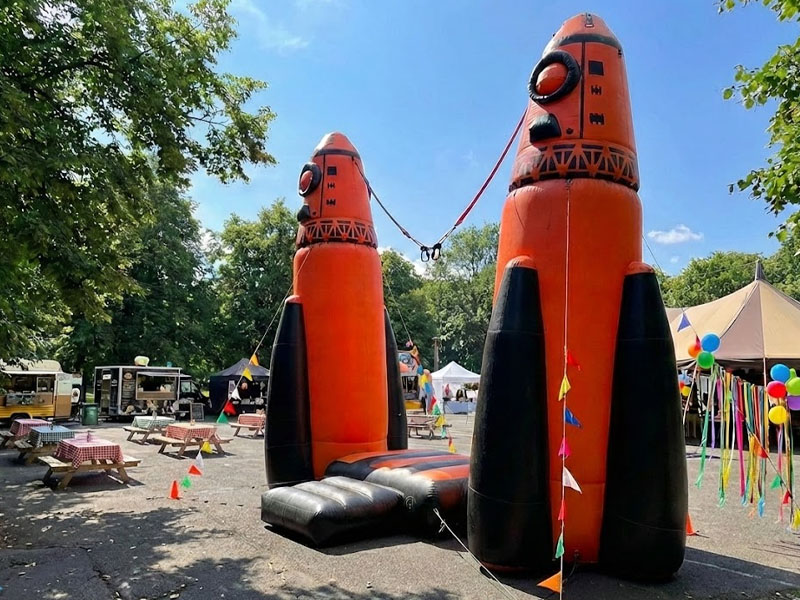 Две огромные надувные пневмофигуры-ракеты, направленные в небо, могут послужить прекрасной декорацией для тематического праздника, например, на космическую или военную тематику.