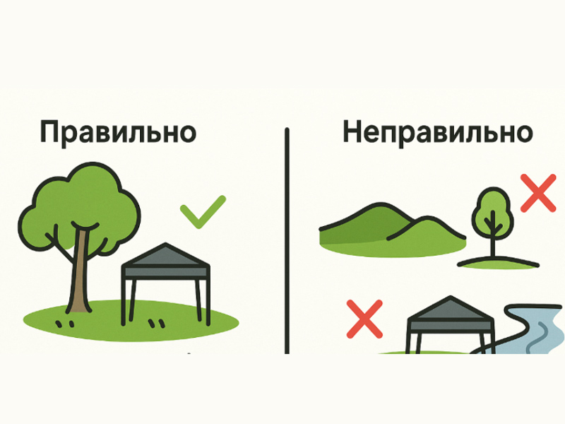 Схема выбора безопасного и удобного места для установки кемпингового шатра.