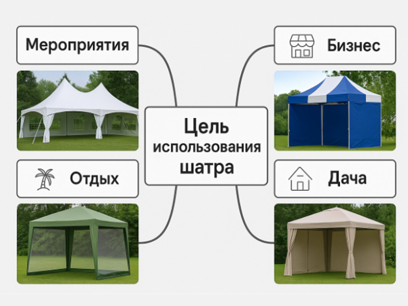 Типы конструкций зависят от размера: большие варианты, такие как арочные шатры, подходят для фестивалей, а малые - для дачи. Варианты шатров многообразны, от простых тентовых навесов до полноценных павильонов. Функциональность напрямую зависит от конструкции и размера: устойчивость к ветру растет с усиленным каркасом, а полезная площадь - с отсутствием внутренних опор. Сферы использования шатра охватывают корпоративные события, отдых на природе и бизнес. Правильный выбор шатра начинается с анализа этих параметров.