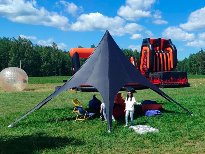 Шатер пагода с характерной конусообразной крышей часто используется как входная группа, небольшая торговая точка или как часть большой композиции из нескольких шатров. Он быстро монтируется и выглядит эффектно. Шатер звезда представляет собой конструкцию с центральной опорой и расходящимися от нее "лучами" тента. Такой шатер привлекает внимание, легко собирается и оптимален для пляжных вечеринок, фестивалей и промо-акций.