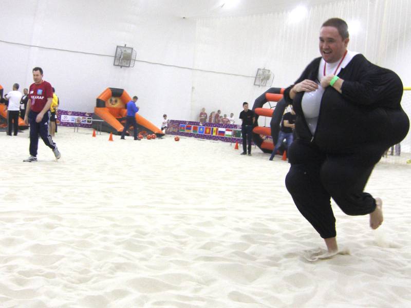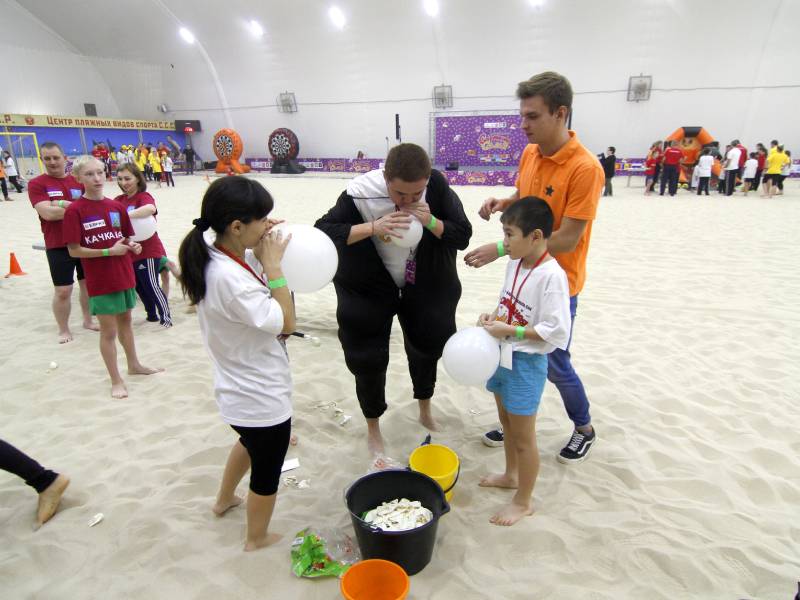 Энергичное командное испытание, подходящее для корпоративов, праздников и спортивных фестивалей. Суть задания проста: вся команда должна быстро надуть воздушные шары и заполнить ими специальный костюм («авоську»), надетый на участника команды. Затем этот участник пробегает дистанцию и возвращается обратно. На финише вся команда дружно лопают шарики через костюм бегуна. Кто быстрей справиться. Вот такая веселуха.)