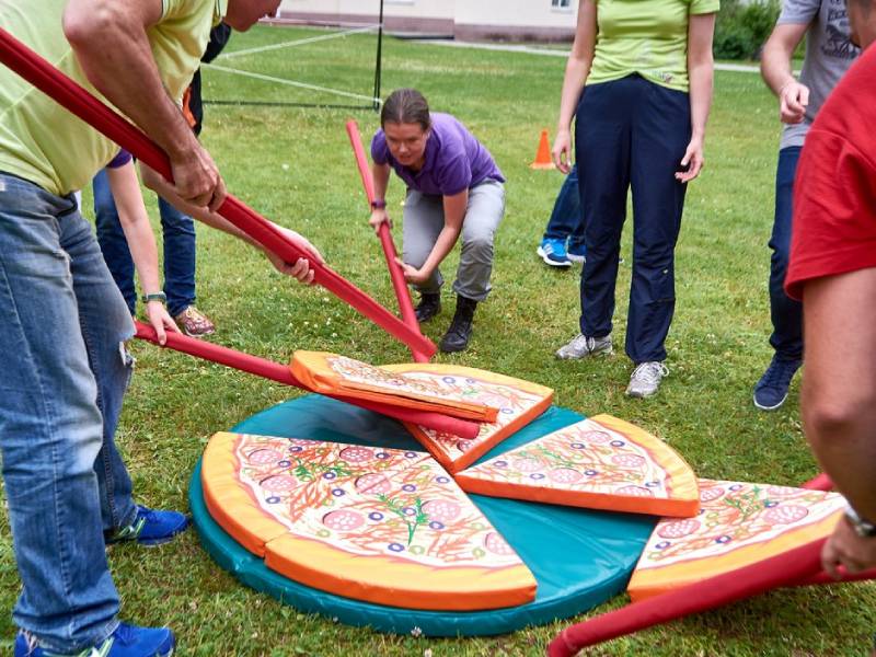 Командное испытание на координацию, синхронность и стратегию. Каждый участник берёт специальную палку-держатель, с помощью которой команда должна аккуратно перенести гигантскую пиццу по кусочкам и собрать её на финишной площадке.