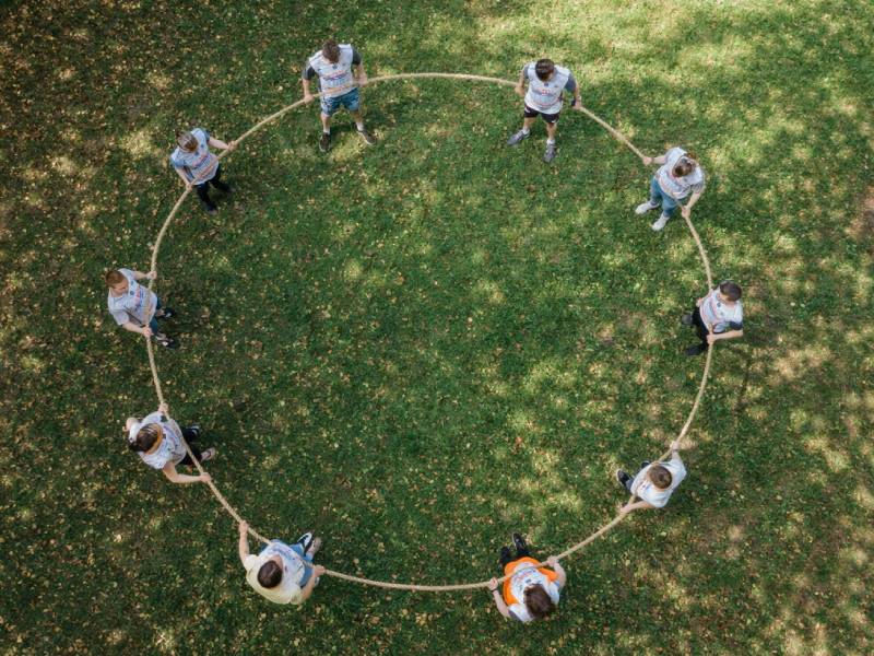 Динамичный тимбилдинг-инструмент для развития доверия, коммуникации и лидерских навыков. Участники держатся за закольцованный канат, их глаза завязаны, и, полагаясь только на голос, логику и чувство плеча, команда должна выстроиться в заданную геометрическую фигуру: круг, квадрат или треугольник.