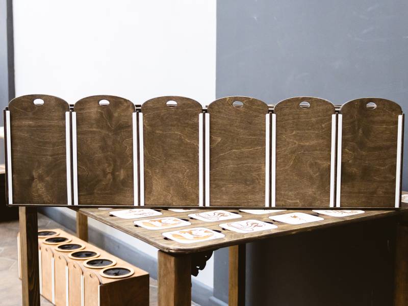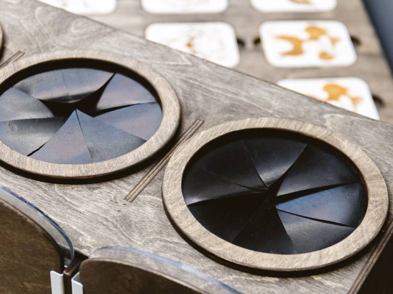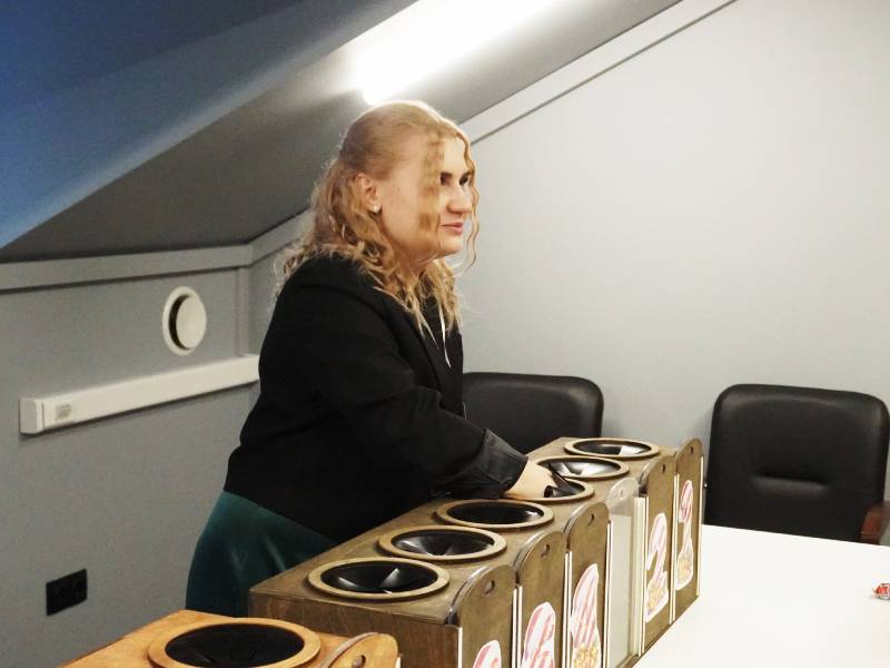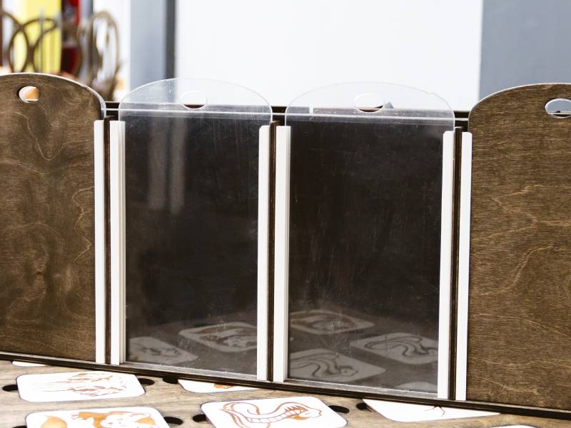 Участники поочерёдно засовывают руки в отсеки и на ощупь пытаются найти нужный предмет, необходимый для выполнения задания.