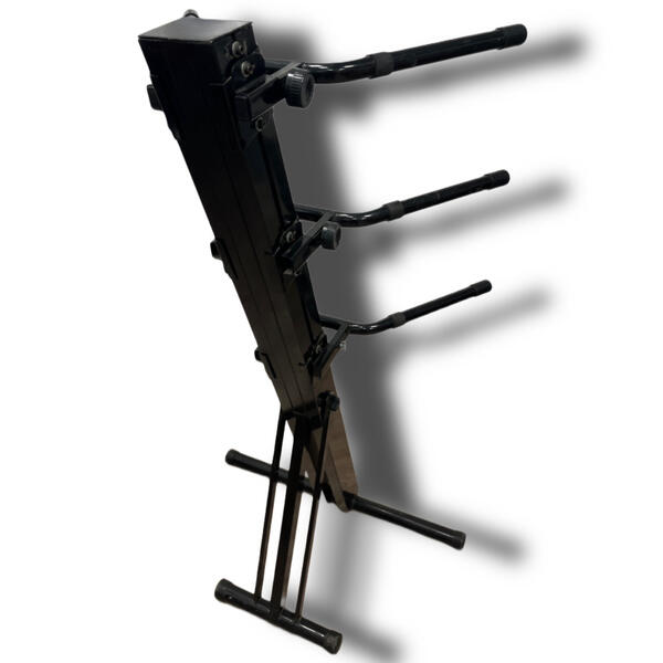 Периодически возникает потребность в прочной стойке с тремя полками. Именно для таких выездов у нас есть богатырь, способный удержать тройку синтезаторов к разу! Причем сборка и разборка его не составляет особого труда, поскольку трубчатые V-образные направляющие легко входят в пазы и зажимаются резьбовыми ручками попарно каждый из этажей.