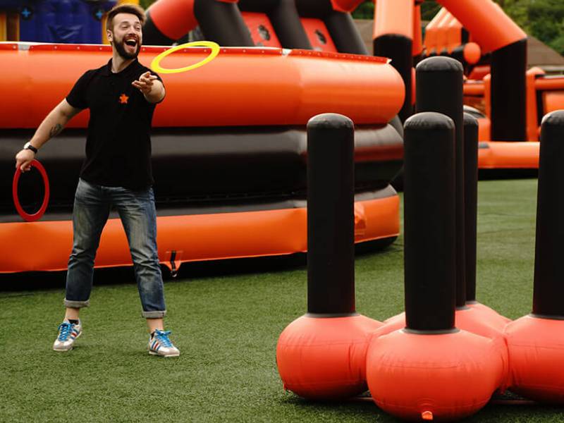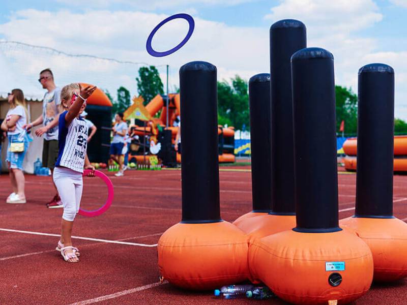Увлекательный аттракцион, позволяющий гостям приятно провести время и испытать удачу. Игровой принцип предельно прост: участник получает несколько обручей и пытается набросить их на конусы надувного кольцеброса. Кажущееся простым, на практике такое занятие оказывается весьма занятным и эмоционально насыщенным.