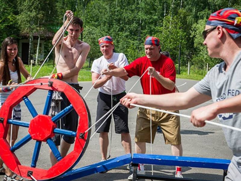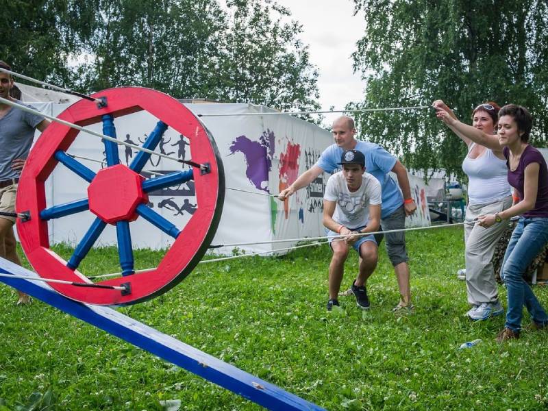 Командный аттракцион, в котором участники ведут огромное деревянное колесо по специальной трассе, управляя им с помощью прикреплённых натянутых верёвок. Передача веревок запрещена, успешное прохождение требует идеальной синхронизации и умения слышать друг друга.