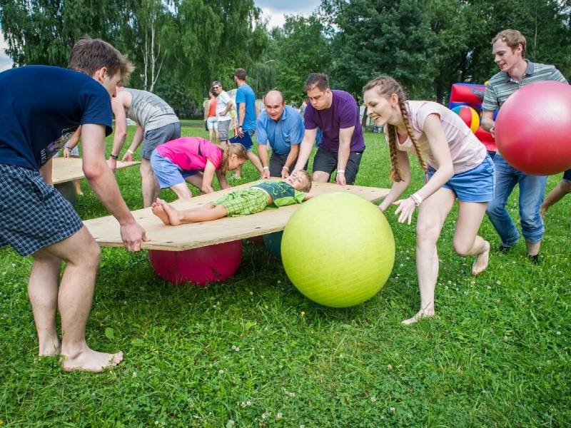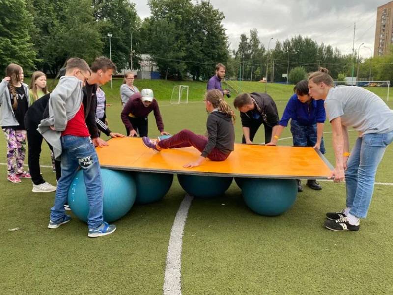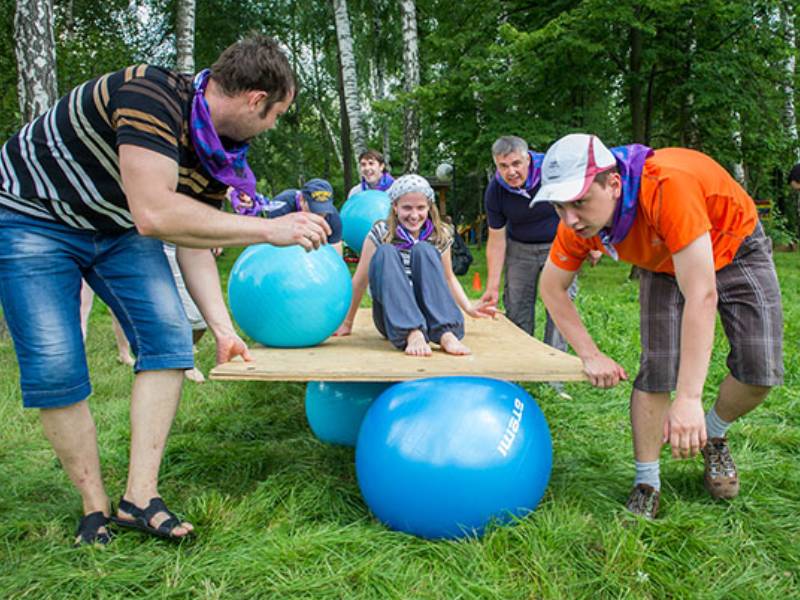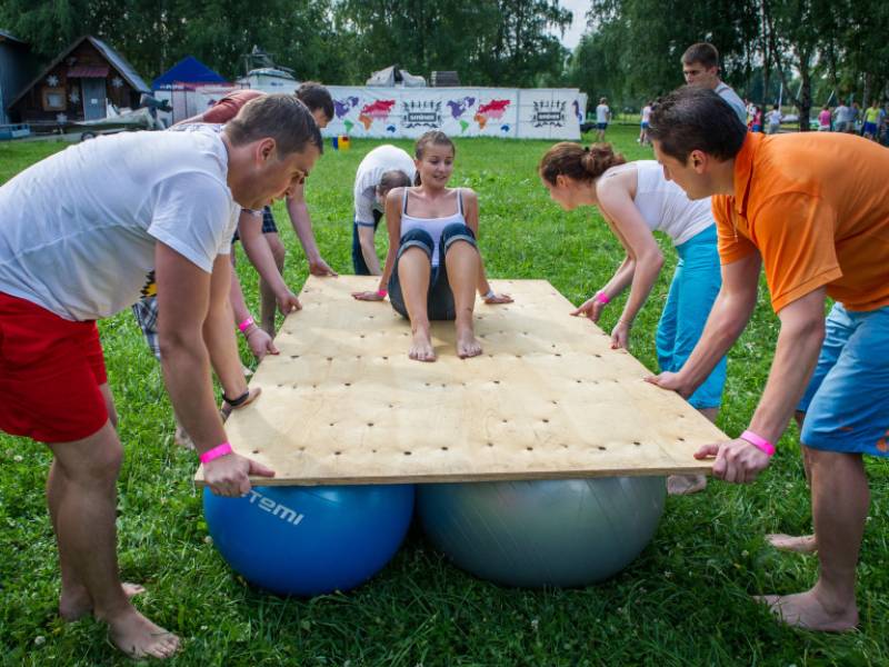 Захватывающая игра на координацию и взаимодействие. Представляет собой большой фанерный щит, установленный на фитнес-мячи (фитболы). Игроки по очереди перемещают мячи, поддерживая равновесие щита и обеспечивая движение вперед. Основная задача — переправить на плоту максимальное число участников команды.