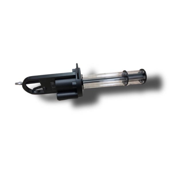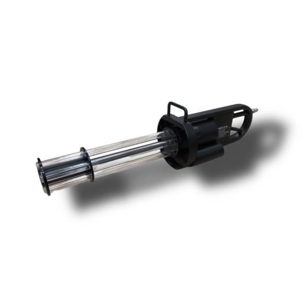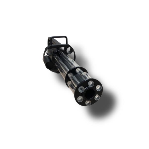Струйная крио-машина с вращающимся барабаном из прозрачных трубок с разноцветной LED-подсветкой, обладающая новым сценическим эффектом динамического RGB-дыма. Идеально подходит для выступлений в ночных клубах, на концертах, корпоративных шоу-программах и выпускных вечерах. Этот крио-пистолет выполнен в новейшем дизайне пулемета Гатлинга, прославленного Арнольдом Шварценеггером в роли Терминатора, и создает ранее незнакомое впечатление от привычной криопушки. Реактивная углекислотная пушка с шестью мощными подсветками крио-струи — это свежее слово в техническом обеспечении дискотек.