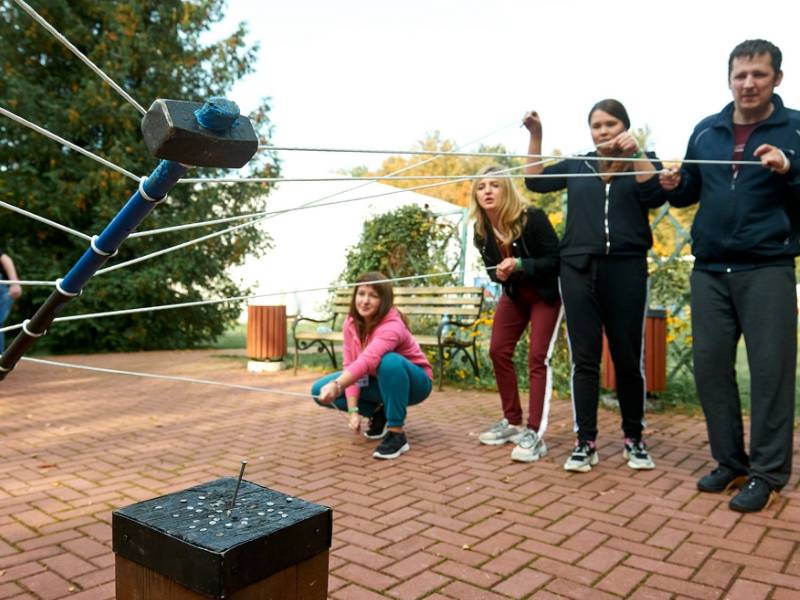 Зрелищный командный аттракцион, где грубая сила уступает место координации и точности. Тяжёлая кувалда подвешена на системе верёвок, за которые держатся участники команды. Только действуя синхронно, управляя направлением и амплитудой движения, команда сможет точно наносить удары и забивать гвозди.