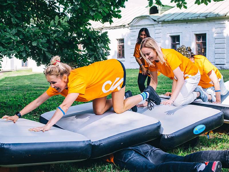 Это активное и увлекательное соревнование, где четверо участников выстраиваются в ряд, надев на плечи надувные рюкзаки. Получив сигнал от инструктора, участники выстраиваются в колонну и становятся на четвереньки, образовав своеобразную живую переправу. Последний участник перебегает вперёд переправы и опять становится на четвереньки, - так переправа двигается. В это время на переправе пятый участник ползёт по ней на четвереньках. Цель: переправить члена команды как можно быстрее.