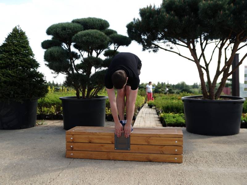 Классическое упражнение для оценки и развития гибкости мышц ног и спины. Участник выполняет наклон вперёд из положения стоя на гимнастической скамье: ноги выпрямлены в коленях, ступни расположены параллельно на расстоянии 10–15 см друг от друга. Движение выполняется плавно, без рывков, с сохранением правильной техники.