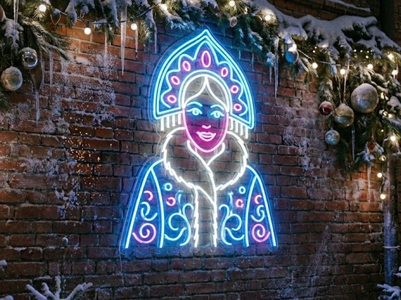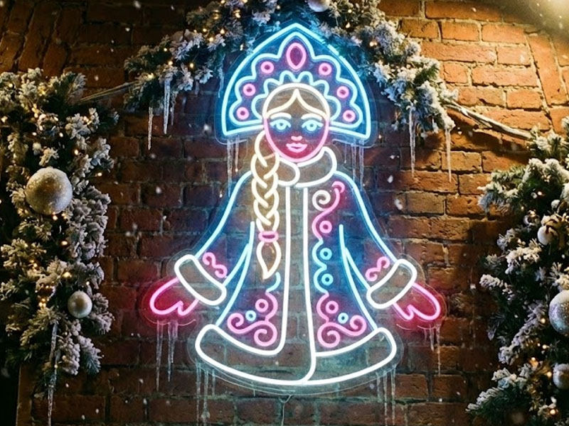 Неоновая вывеска «Снегурочка» в аренду — праздничный световой элемент, который создаёт атмосферу зимней сказки и отлично дополняет новогоднее оформление. Подходит для фотозон, корпоративов, торговых пространств, детских мероприятий и тематических вечеринок. Яркое сияние неона красиво смотрится на фото. В аренду включены доставка, установка и безопасное подключение.