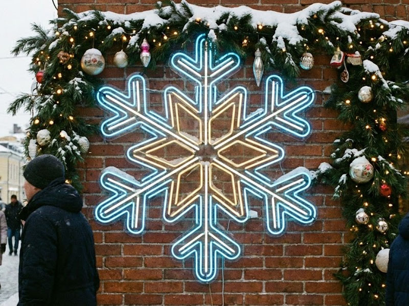 Неоновая вывеска «Снежинка» в аренду — стильный и атмосферный новогодний элемент, который создаёт зимнее настроение и украшает площадку. Подходит для фотозон, корпоративов, витрин, праздничных вечеринок и оформления помещений. Мягкое сияние неона делает фото яркими и эффектными. В аренду включены доставка, установка и безопасное подключение.