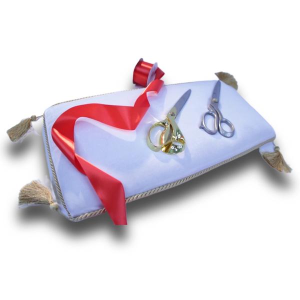 Ножницы презентационные на белой подушке-подносе в аренду на мероприятие
