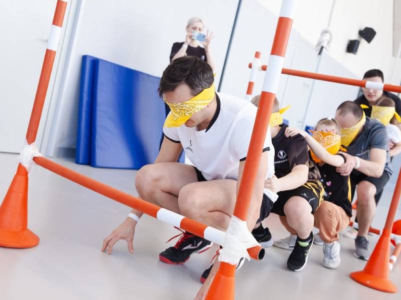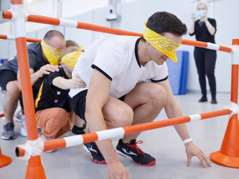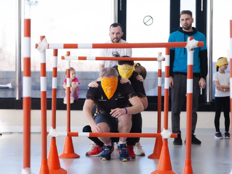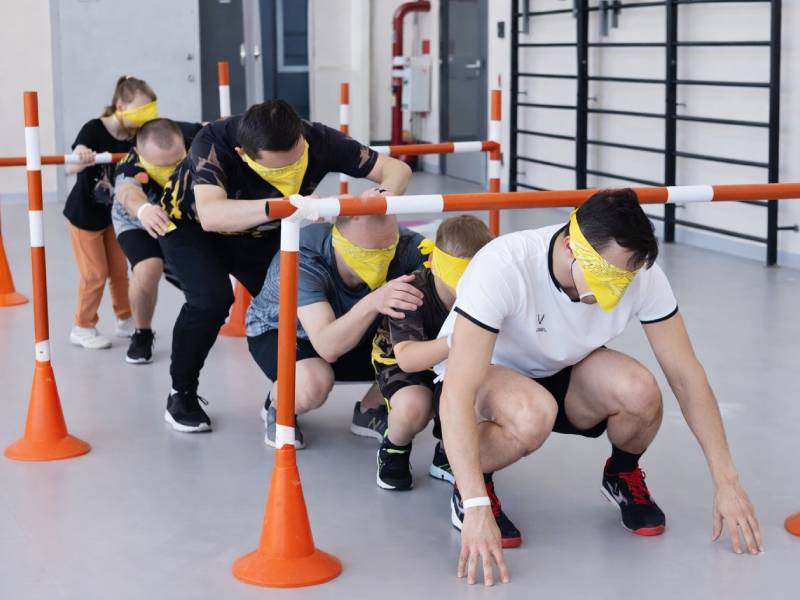 Интересное командное испытание, развивающее доверие, сплоченность и навыки эффективной коммуникации. Суть игры проста: участники выстраиваются в шеренгу, крепко держатся друг за друга и надевают повязки на глаза, оставляя зрение только последнему игроку («машинисту»). Его задача — вести всю команду безопасным маршрутом, обходя препятствия и поворачивая на крутых виражах, используя четкую речь и тактильные сигналы.