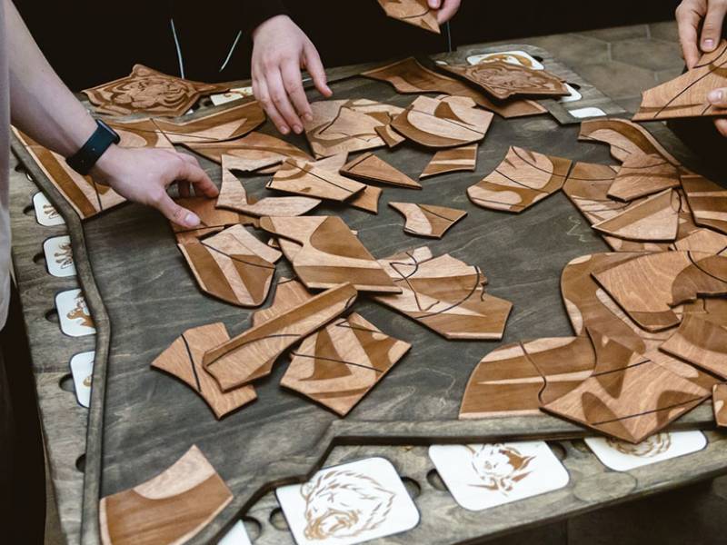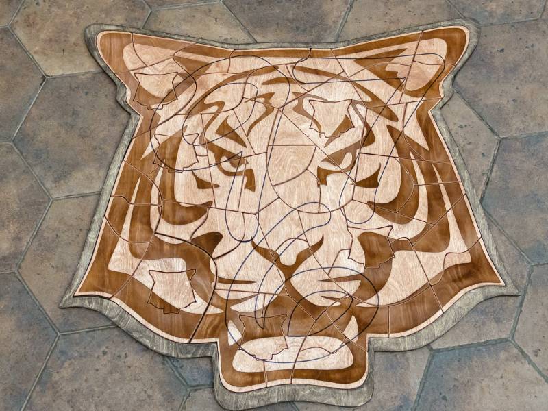 Гигантский тематический деревянный пазл «Форт Боярд» в виде головы тигра — эффектный интерактив для мероприятий, тимбилдингов и игровых зон. Конструкция состоит из 50 массивных элементов, и собрать её — настоящий вызов даже для самых сообразительных участников.