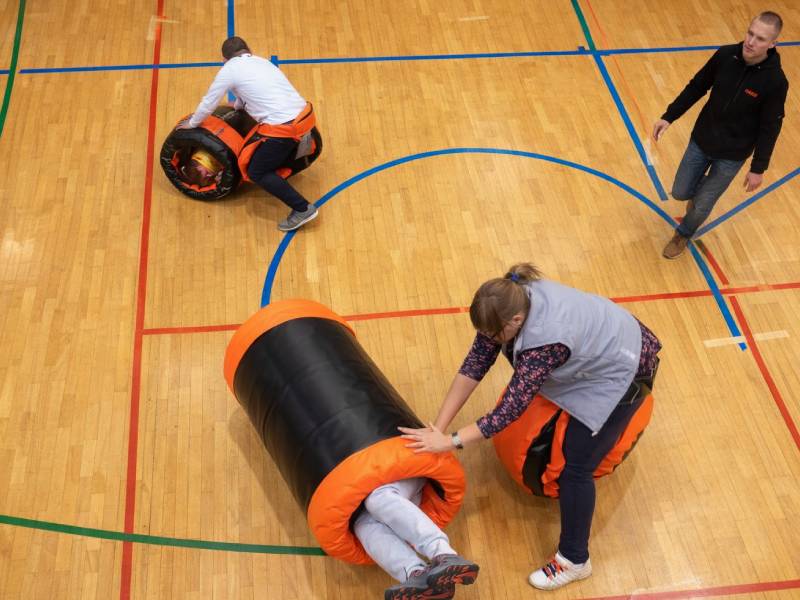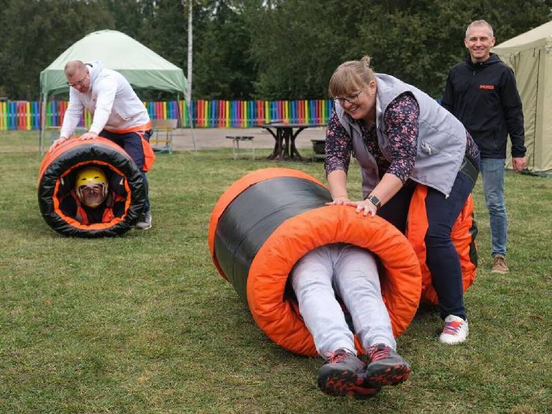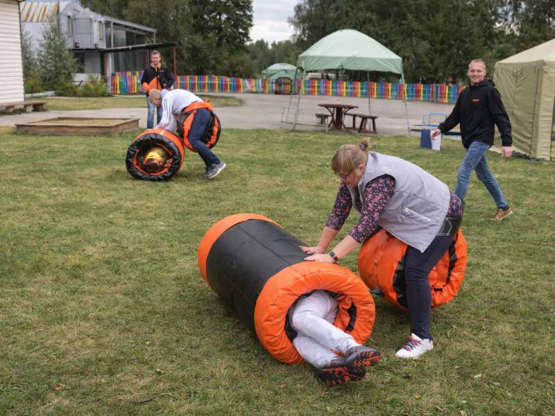 Этап-эстафета, в которой участник, надев потешный памперс, перекатывает большой цилиндр со вторым героем внутри. Задача: сделать это максимально быстро на время или опередить соперника.