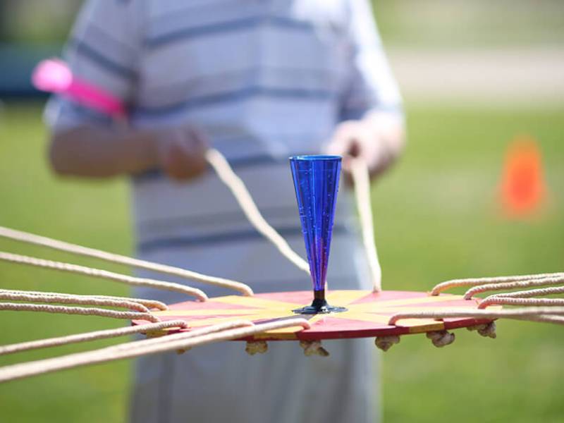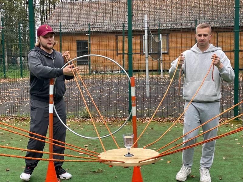 Задание на прокачку точности командных движений, аккуратности и слаженной командной работы в режиме ограниченного времени. Суть игры заключается в прохождении трассы из нескольких колец, закреплённых на стойках, круглым подносом, который контролируется несколькими участниками одновременно посредством специальных верёвочных оттяжек. Главное условие успешного прохождения, - сохранить предмет (чаще всего стакан с водой или теннисный мячик) на подносе.