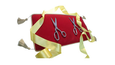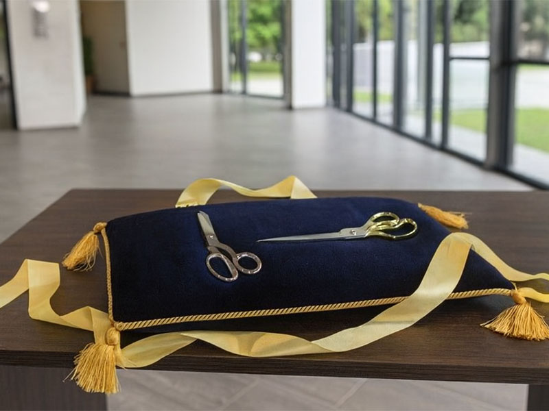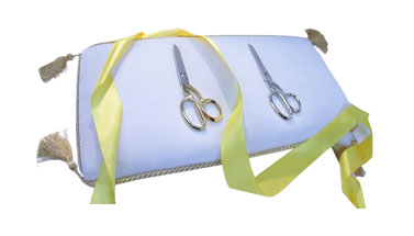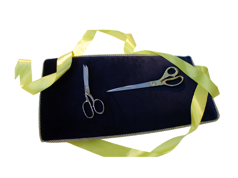 Эта подушка-поднос идеально впишется в стиль вашего торжественного открытия. Выполненная в модном черном цвете, она украшена по периметру желтой бахромой с четырьмя элегантными кисточками по углам. Верхняя и нижняя части обтянуты мягким бархатом, что позволяет инструменту для перерезания ленточки слегка утопать в ворсе, надежно фиксируясь и предотвращая соскальзывание.