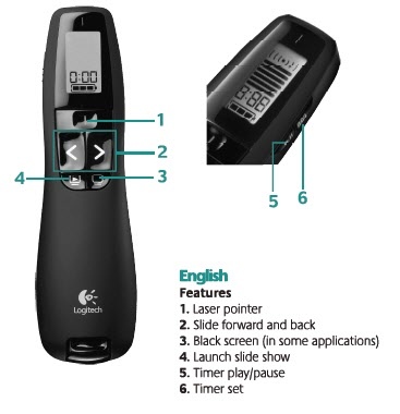 Беспроводной пульт-кликер для проведения презентаций, оснащенный удобными элементами управления и лазерной указкой с ярким красным лучом, поможет вам провести презентацию более убедительно и наглядно. Интуитивно понятное управление показов слайдов. Кнопки кликера легко распознать на ощупь. Благодаря эргономичной форме это управляющее устройство удобно держать в руке. Надежное управление презентацией от первого до последнего слайда. Лазерная указка с красным лучом: Ваша аудитория легко увидит то, на что вы указываете (на видеоэкране или ЖК-телевизоре). Оцените свободу перемещения во время своего повествования и возможность более плотной работы с аудиторией, усиливающие впечатление от презентации. Индикатор заряда элемента питания презентатора: Теперь вы сможете определить уровень заряда батарей, просто взглянув на экран. Беспроводной миниатюрный приемник с функцией самонастраивающегося подключения: Этот кликер не требует установки дополнительных программ. Просто подключите приемник к USB-порту, и можно приступать к работе. После работы приемник можно убрать внутрь корпуса устройства.