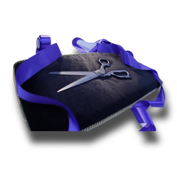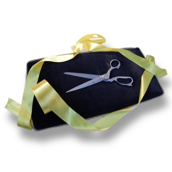 Эта подушка-поднос идеально впишется в стиль вашего торжественного открытия. Выполненная в модном черном цвете, она украшена по периметру желтой бахромой с четырьмя элегантными кисточками по углам. Верхняя и нижняя части обтянуты мягким бархатом, что позволяет инструменту для перерезания ленточки слегка утопать в ворсе, надежно фиксируясь и предотвращая соскальзывание.