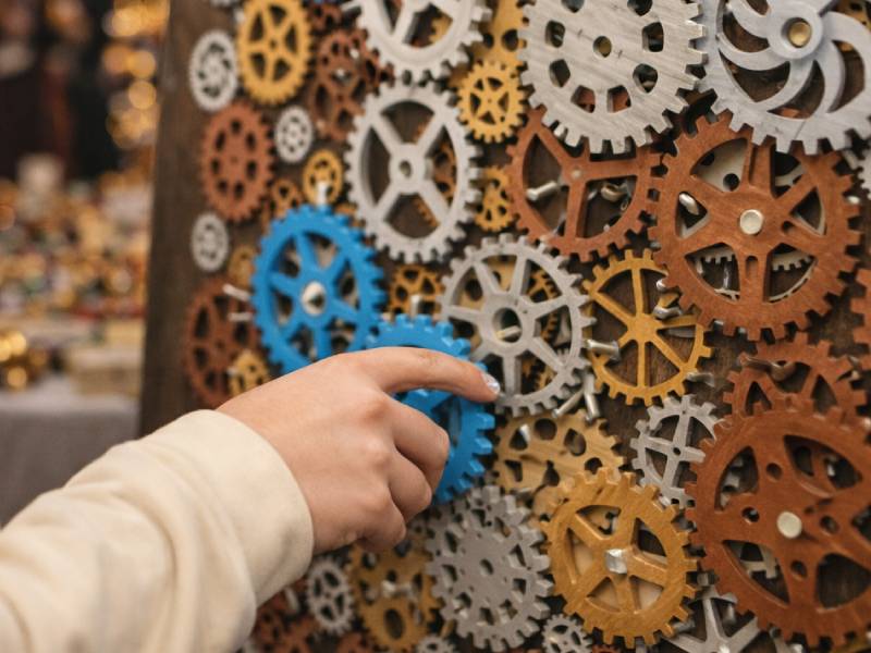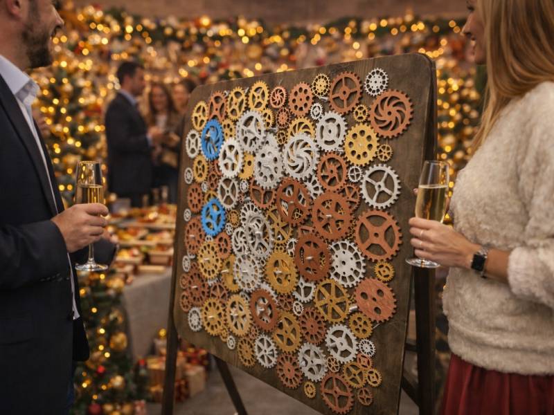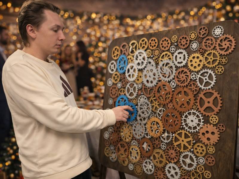Пять минут до нового года, а часовой механизм наших новогодних часов развалился. Участникам необходимо собрать шестерёнки механизма в правильной последовательности и восстановить работу часов, чтобы пришёл новый год! Идеально подходит для сбора гостей в качестве игровой станции, конкурсов и активностей с ведущим.