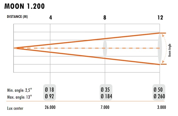 Прожектор следящего света MOON 1200: 6 цветов по 3 дихр. фильтра + белый, ирис, blackout, zoom до 16 м.