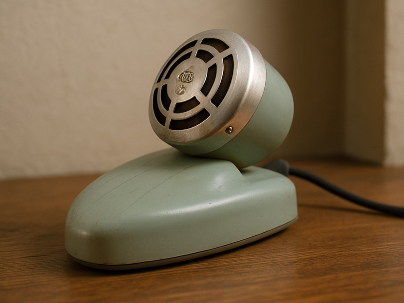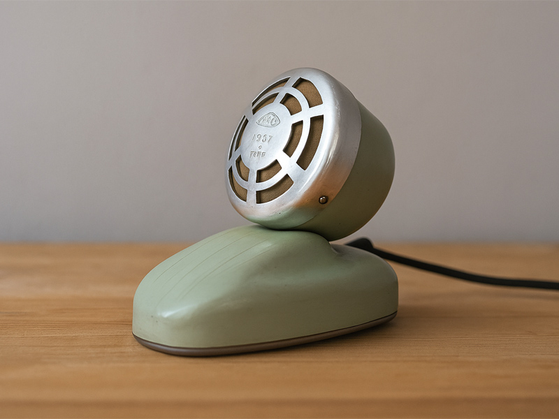 Увесистая подставка, тканевый кабель соединения с усиливающим устройством. Подобные модели часто использовались в дикторских кабинках на стадионах, в радио-рубках пионерских лагерей и домов культуры в СССР. Выпуск 1957 года. Мог поставляться в комплекте с ламповым магнитофоном.