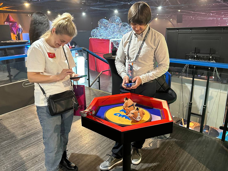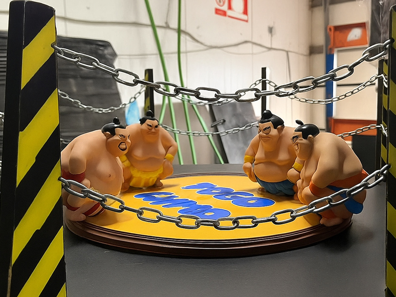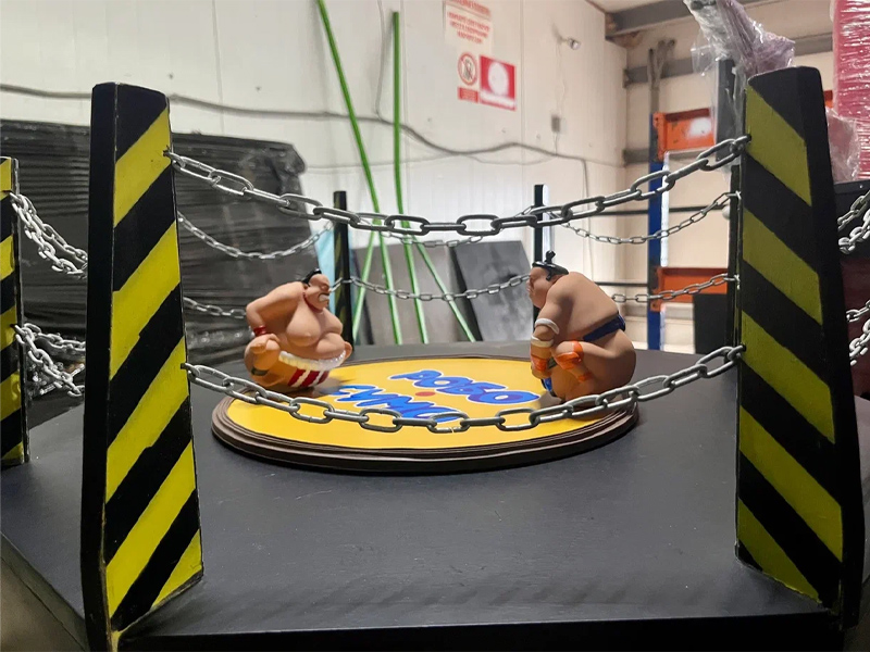 Робо-сумо — это миниатюрный ринг диаметром около 70 см, установленный на подставке высотой 80 см. На арене сражаются два радиоуправляемых бойца — красный и синий сумоисты, а участники управляют ими при помощи удобных джойстиков, устраивая захватывающие поединки.
