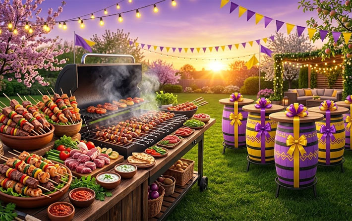 С 1 по 11 мая действует эксклюзивное предложение для больших компаний. Закажите 100 шашлыков для вашего мероприятия и получите приятный бонус — аренду 5 дизайнерских столов-бочек в подарок.