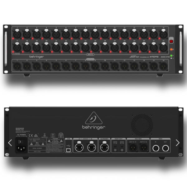 Behringer S32 — это стейджбокс для цифровых микшерных пультов и сценический коммутационный блок. Он оснащен 32 полностью программируемыми микрофонными MIDAS-предусилителями и 16 аналоговыми сервосбалансированными XLR-выходами. Прибор имеет двойной сетевой порт AES50 с ультранизкой задержкой для каскадного объединения, Ultranet-порт для системы персонального мониторинга Behringer P16, два АЕС3-порта для прямого подключения цифровых акустических систем и пару ADAT выходов. MIDI-вход/выход обеспечивает двухнаправленную связь. Устройство поддерживает удаленную работу по Cat5e-кабелю до 100м, имеет USB-разъем для обновления системы и импульсный источник питания для понижения шума и небольшого энергопотребления.