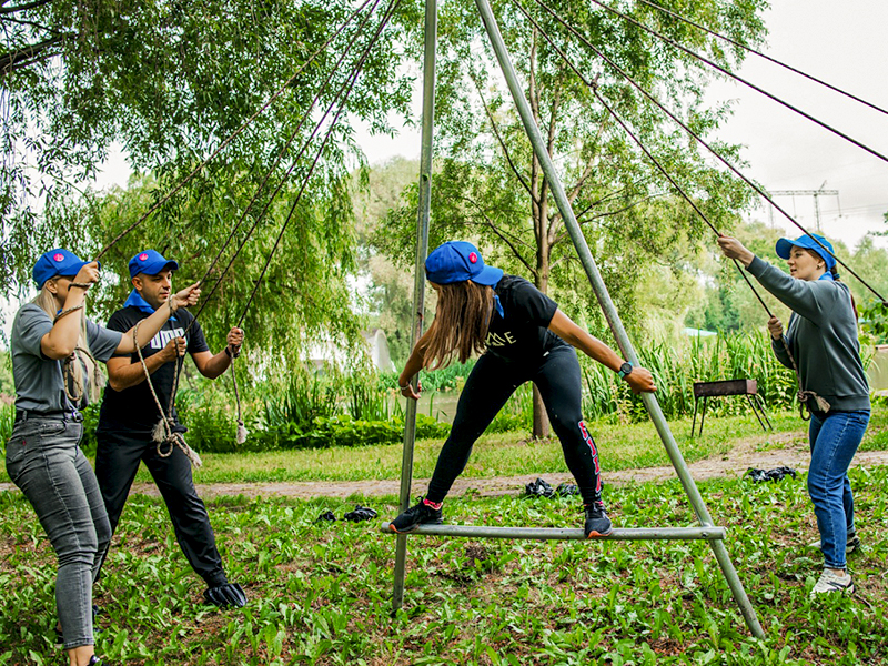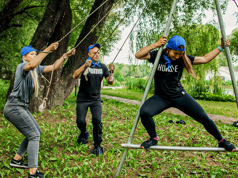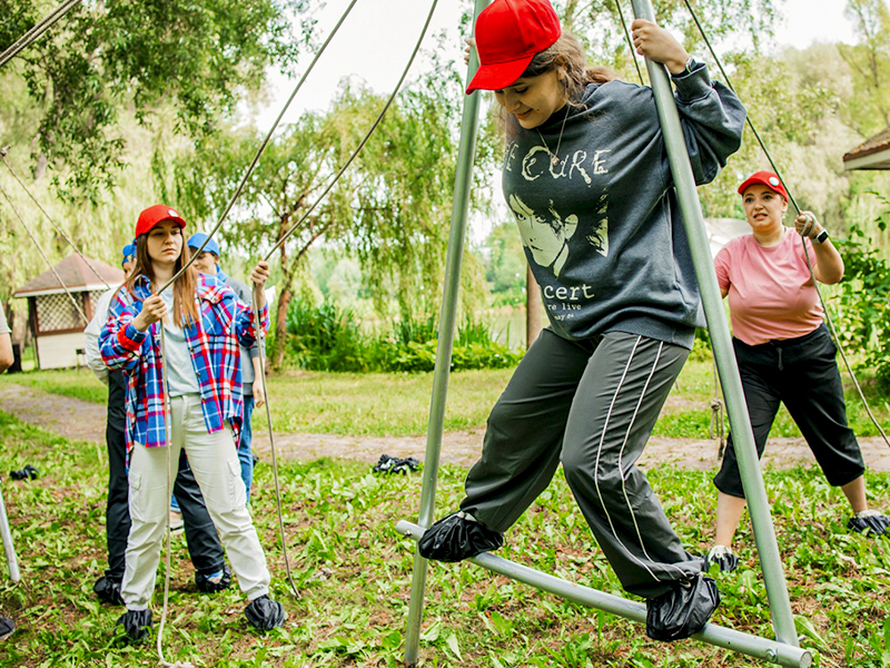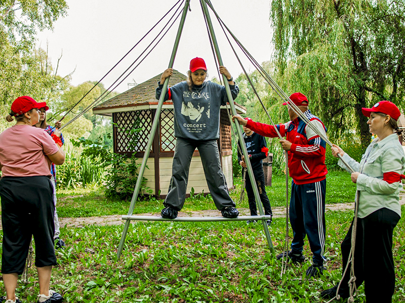 Уникальный инструмент для укрепления командного духа и отработки взаимодействия внутри коллектива. Задача игроков состоит в управлении большим алюминиевым шагомером посредством натянутых верёвок таким образом, чтобы стоящий сверху участник смог успешно преодолеть заданную дистанцию.