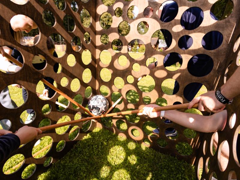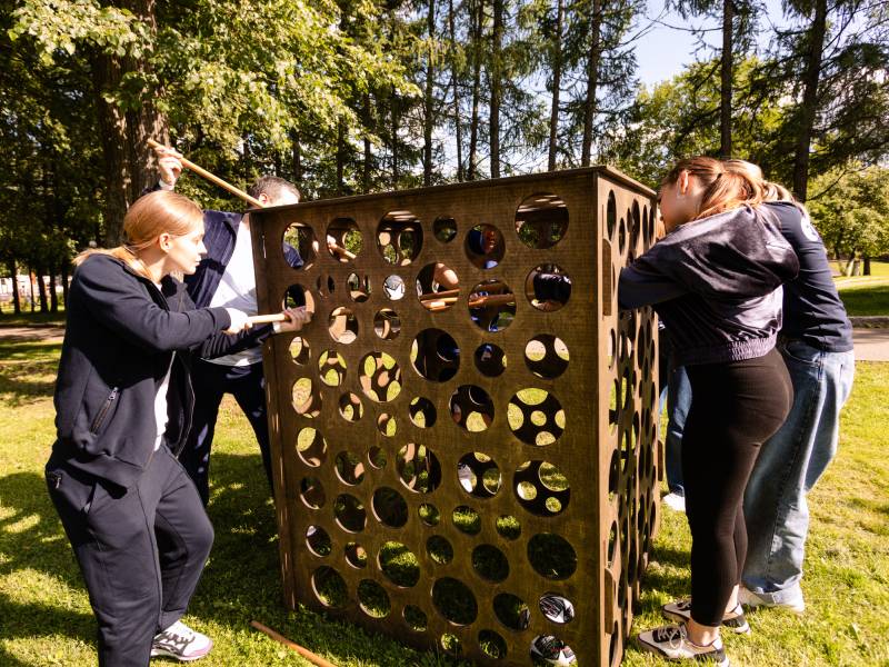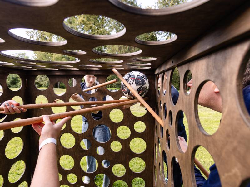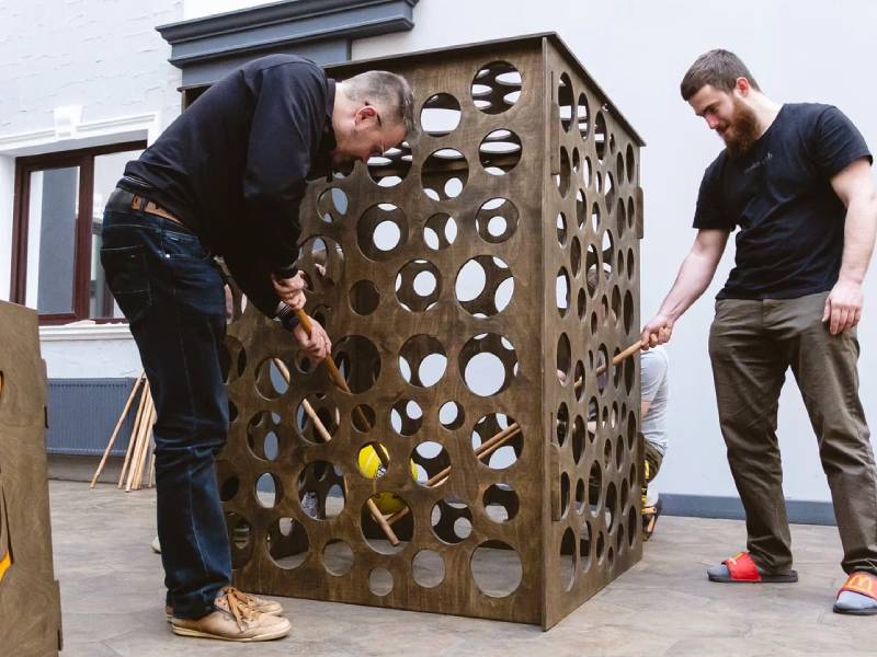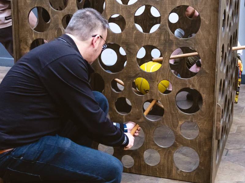 Задача участников — достать мячик из куба через верхнее отверстие, используя специальные палочки.