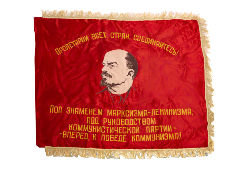 Двойной бархатный кумачевый флаг с желтой бахромой, изображением Владимира Ильича Ленина и надписью "Под знаменем Марксизма-Ленинизма под руководством коммунистической партии - вперед к победе коммунизма!"