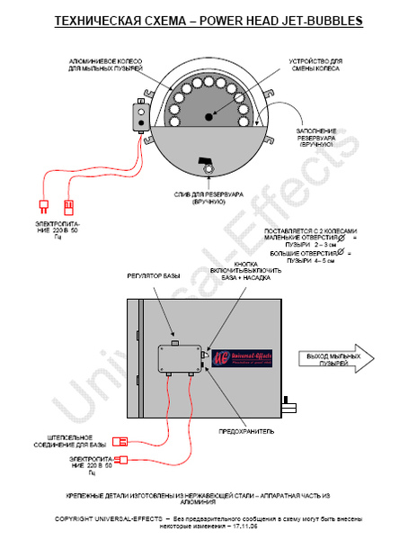 С ним сказочный зазеркальный мир и волшебство возможно на улице, в помещении, у берега моря, прямо на центральной площади. Огромное количество магических шаров способно создать атмосферу настоящего веселья, масштабного события. Этот эксклюзивный монстр производит пузырики двух размеров, и настроить его несложно. Аппарат Universal Effects Power Head Jet-Bubbles позволит вам сделать яркое торжество, представление, шоу из многочисленных радужных сфер, которые будут улетать далеко вдаль, с достаточной плотностью, зрелищностью и привлекательностью. Подобные машины заказывают для программ в парках, на театральных сценах, пляжах, футбольных стадионах и т.п. А с музыкальным сопровождением реально добиться просто невероятного эффекта.