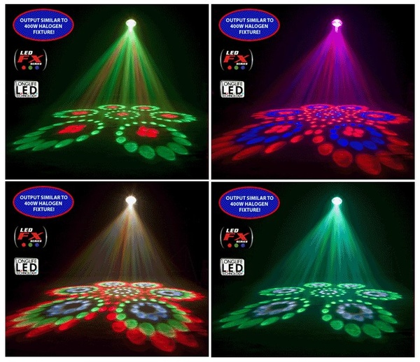 Revo III — это цветомузыкальный эффект, создающий бегающие резкие красные, зеленые и синие лучи. Он идеально подходит для бюджетных дискотек и вечеринок, проецируя яркие лучи и тоннели в красном, зеленом, синем и белом цветах. Прибор удивит вас эффектом семи «лунных цветков».