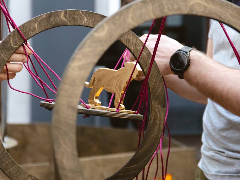 Участники встают в круг и берутся за верёвки специальной платформы, на которую устанавливается тигр.