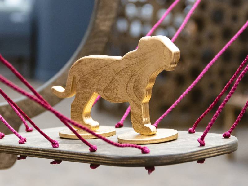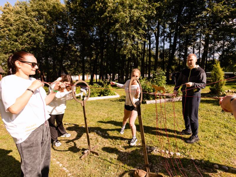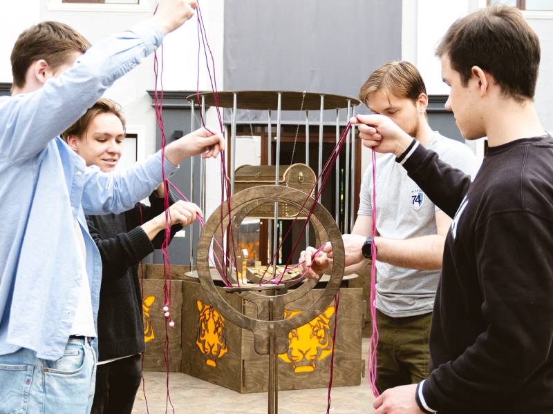 Задача команды — аккуратно пронести платформу с тигром, не уронив его, через все кольца на ножках, расположенные на расстоянии друг от друга.