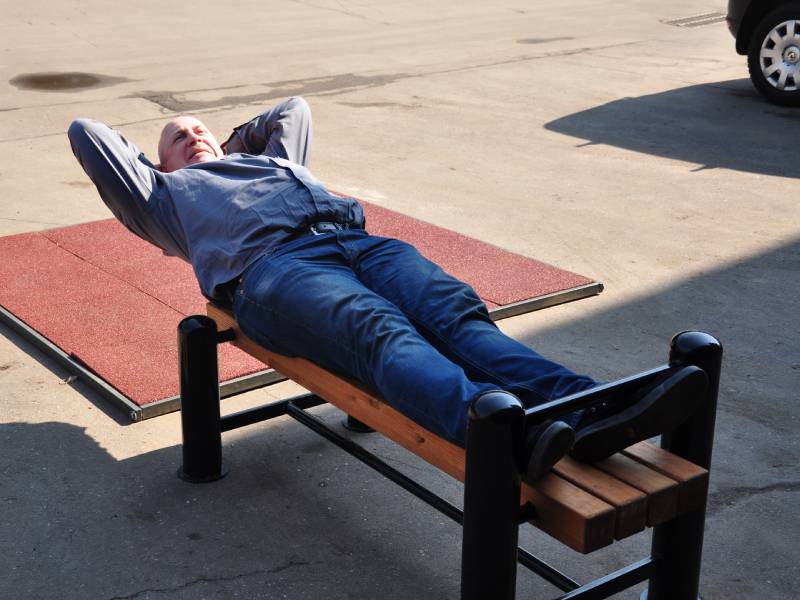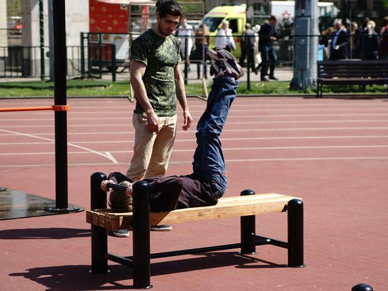 Классическое испытание на силу, выносливость и технику. Участник располагается лёжа на спине на гимнастической скамье: руки за головой, пальцы сцеплены в «замок», ноги согнуты под прямым углом, ступни плотно прижаты к полу. По сигналу выполняется максимальное количество подъёмов туловища за отведённое время — с обязательным касанием локтями бёдер и полным возвратом в исходное положение.